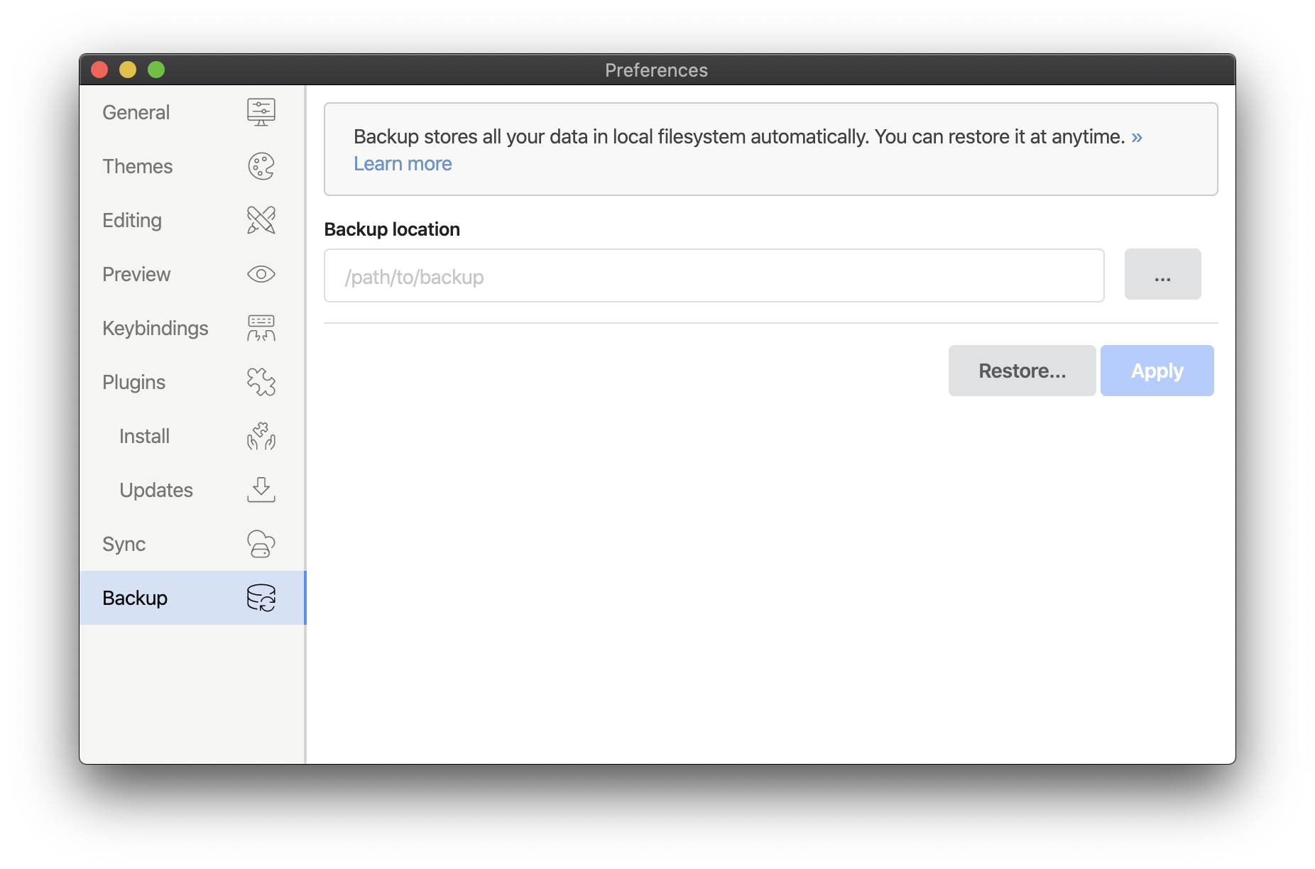 You can back up all your data to your local filesystem and restore from them anytime. Inkdrop stores your data as the JSON files continuously while you use them. It works like a local replication.