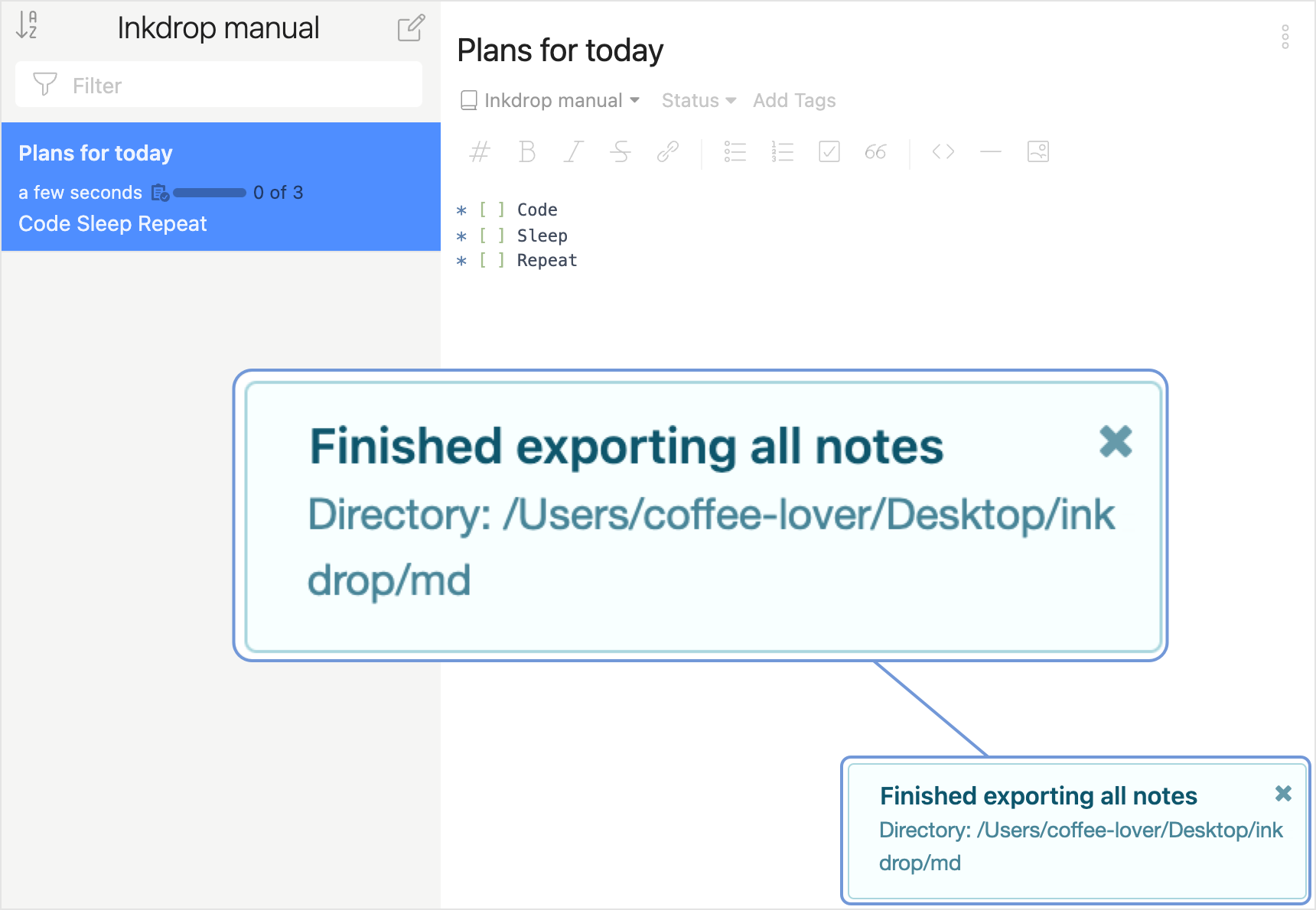When exporting is finished, you'll see the Finished exporting all notes message in the lower-right corner of the app: