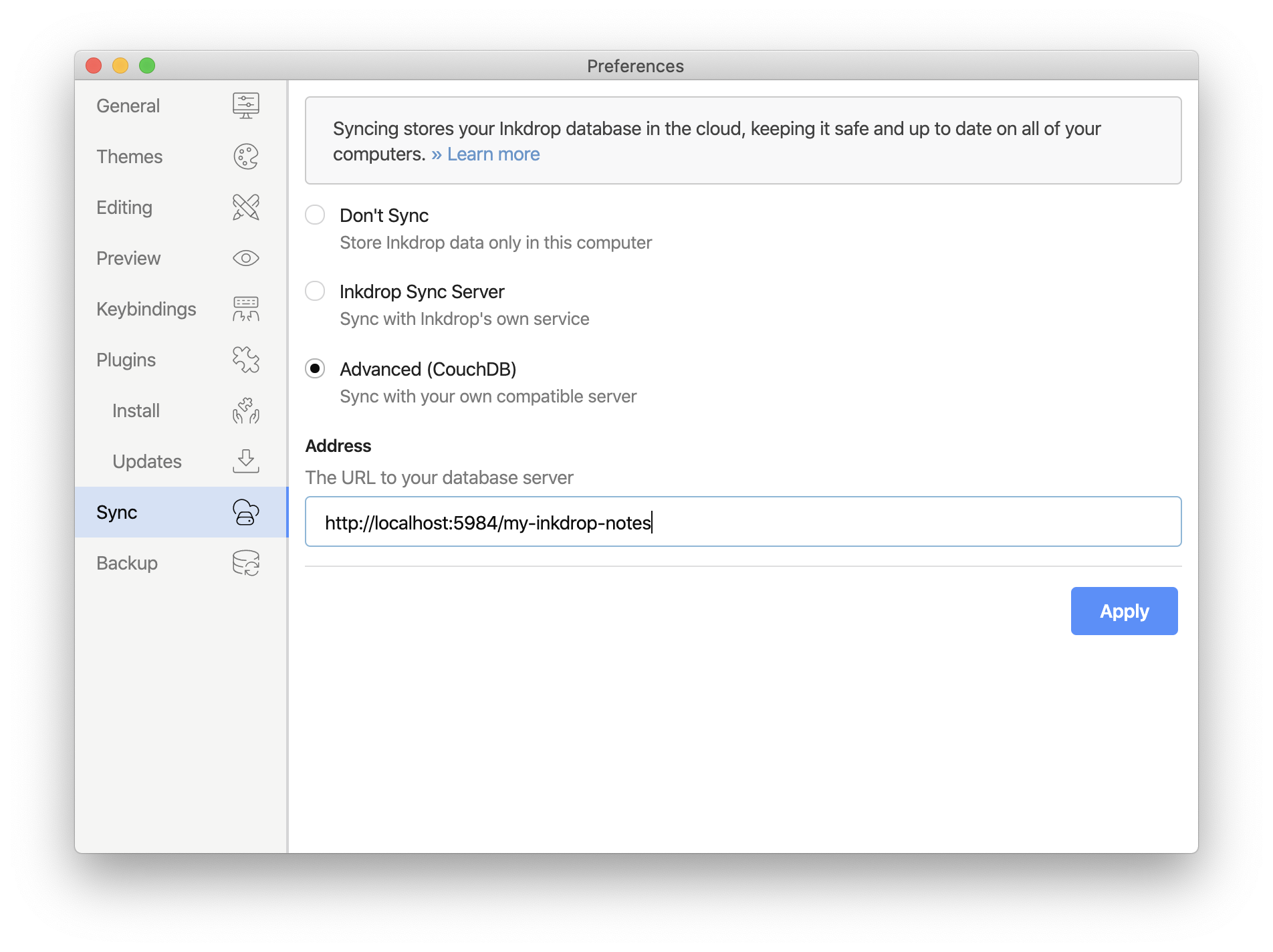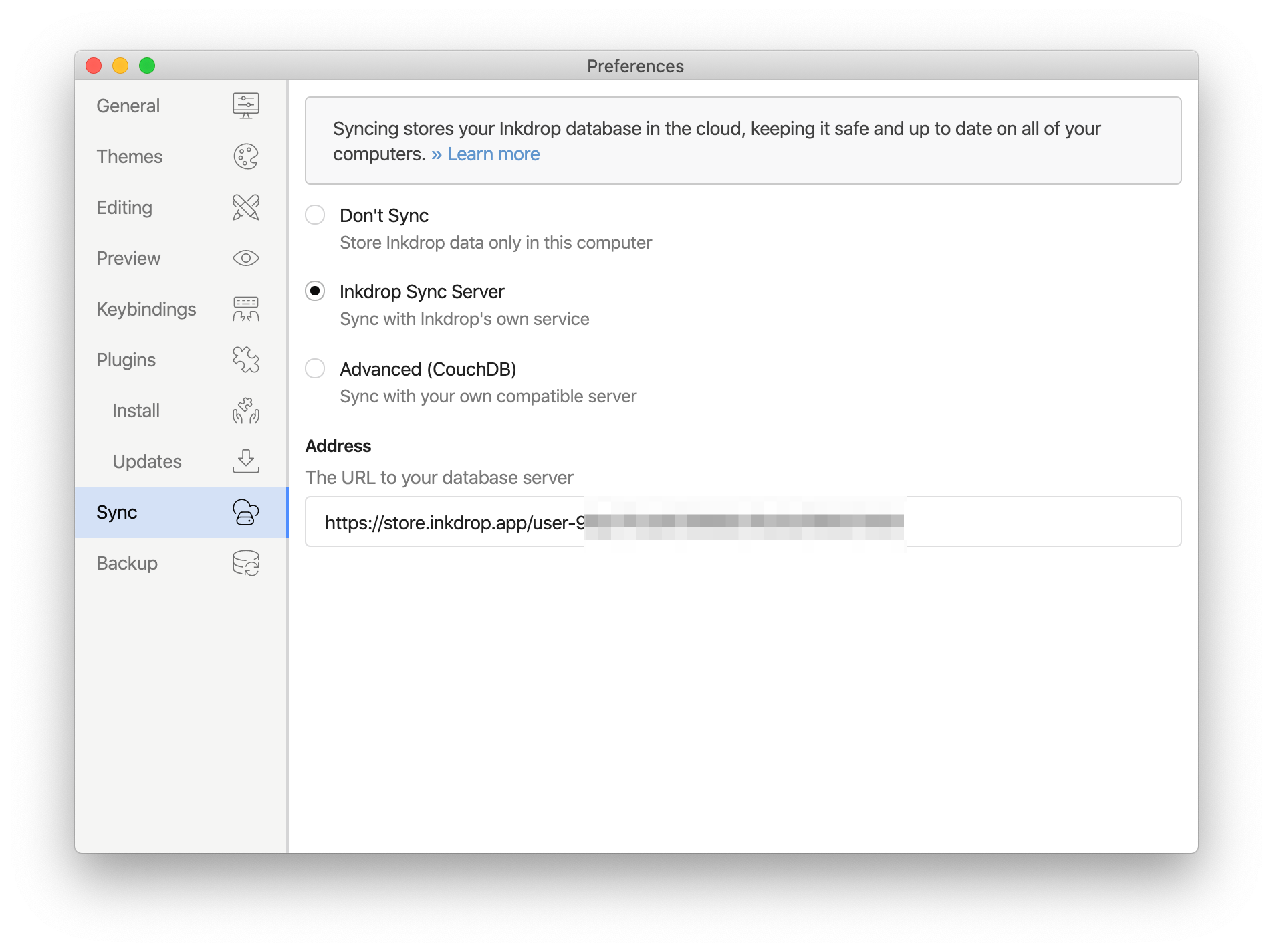 Return to the Inkdrop sync preferences, you can input the URL to your database to the Address section: