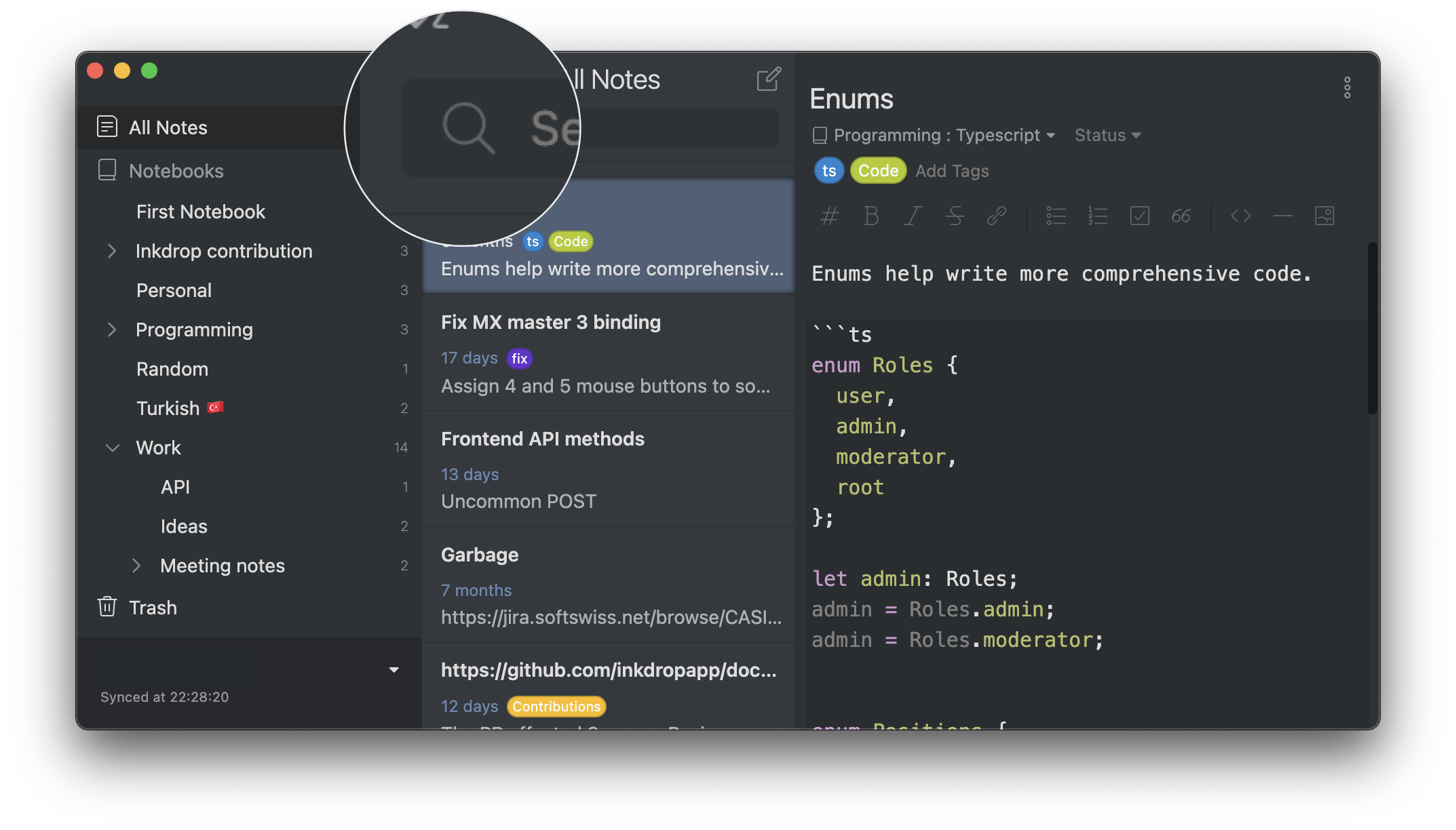 - Searching: Inkdrop looks for notes among all the records in the database. You can think of it as a global search.