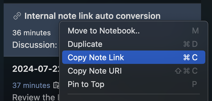 - Select "Copy Note Link" from the context menu, or press Command + C on macOS or Ctrl + C on Linux and Windows while the note is selected in the note list