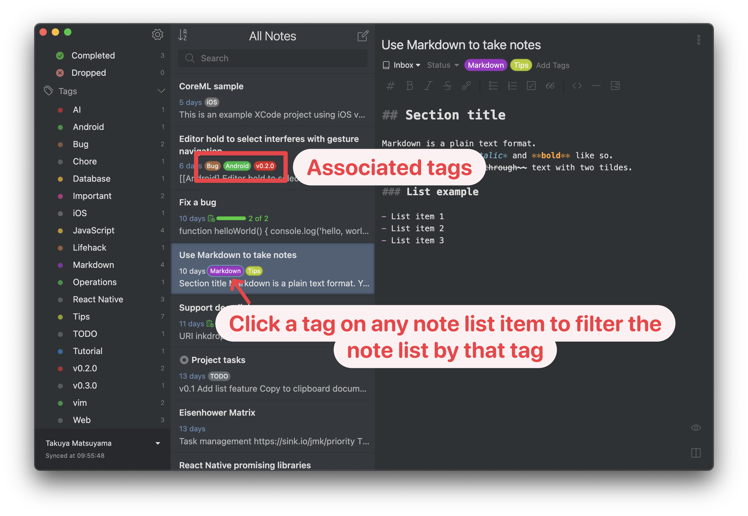 You can quickly filter by a tag by clicking one on the note list. By selecting multiple tags, you can narrow down your note list to include only the notes that meet all selected criteria, making it even easier to find exactly what you’re looking for.