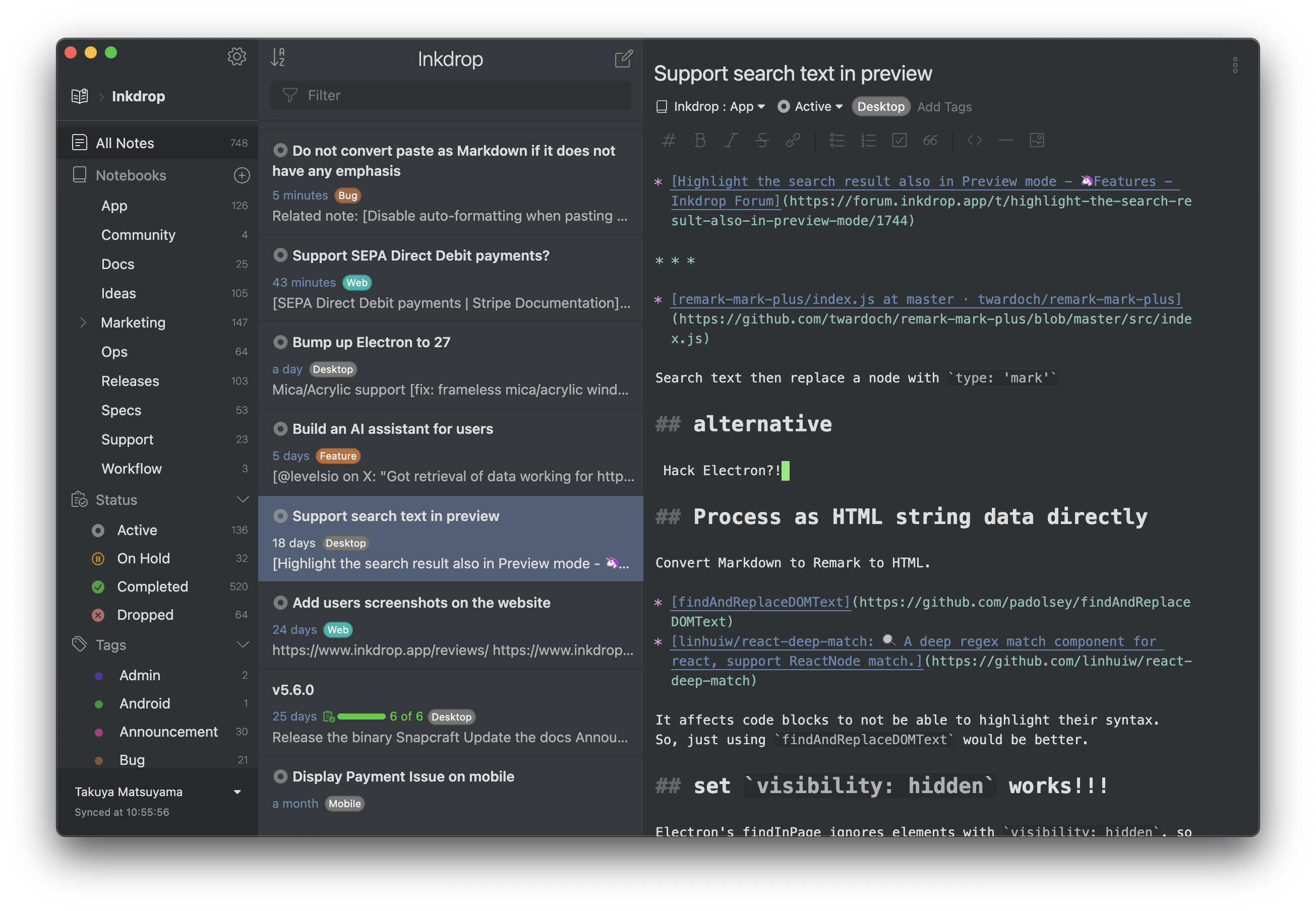 Here, developers track bug reports, performance issues, feature requests, and roadmap discussions. When working on your project, you'll likely encounter similar challenges, ideas, or questions. Inkdrop encourages you to create one note for each of these instances. For a bug, start a new note; for a fresh idea, another note. For example, please take a look at the following screenshot:
